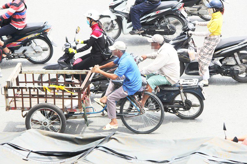 Người lái xe máy cũ vừa không đội mũ bảo hiểm vừa đẩy xe khác trên đường phố TP.HCM. (Báo PLTP.HCM)