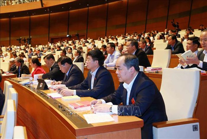 Các đại biểu dự Hội nghị tại điểm cầu chính - Phòng họp Diên Hồng, Nhà Quốc hội (Hà Nội), chiều 27/3/2021. (Ảnh: TTXVN)