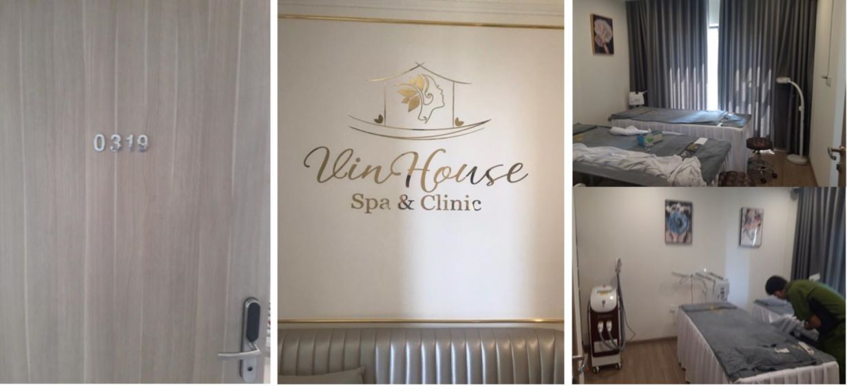 Khi đến đúng địa điểm theo tin báo của người dân cung cấp, Đoàn kiểm tra không thấy biển hiệu ngay bên ngoài căn hộ số 0319. Nhưng khi bước vào bên trong, tại khu vực quầy lễ tân thì phát hiện biển hiệu “Vin House Spa & Clinic”, tại đây có treo 2 bảng giá dịch vụ (1 bảng giá chăm sóc da và 1 bảng giá phẫu thuật thẩm mỹ), cũng tại khu vực này cơ sở bố trí 2 giường gội đầu. Tại đây, nhân viên cơ sở này chưa xuất trình Giấy đăng ký kinh doanh, Chứng chỉ hành nghề và Giấy phép hoạt động theo quy định của pháp luật.
