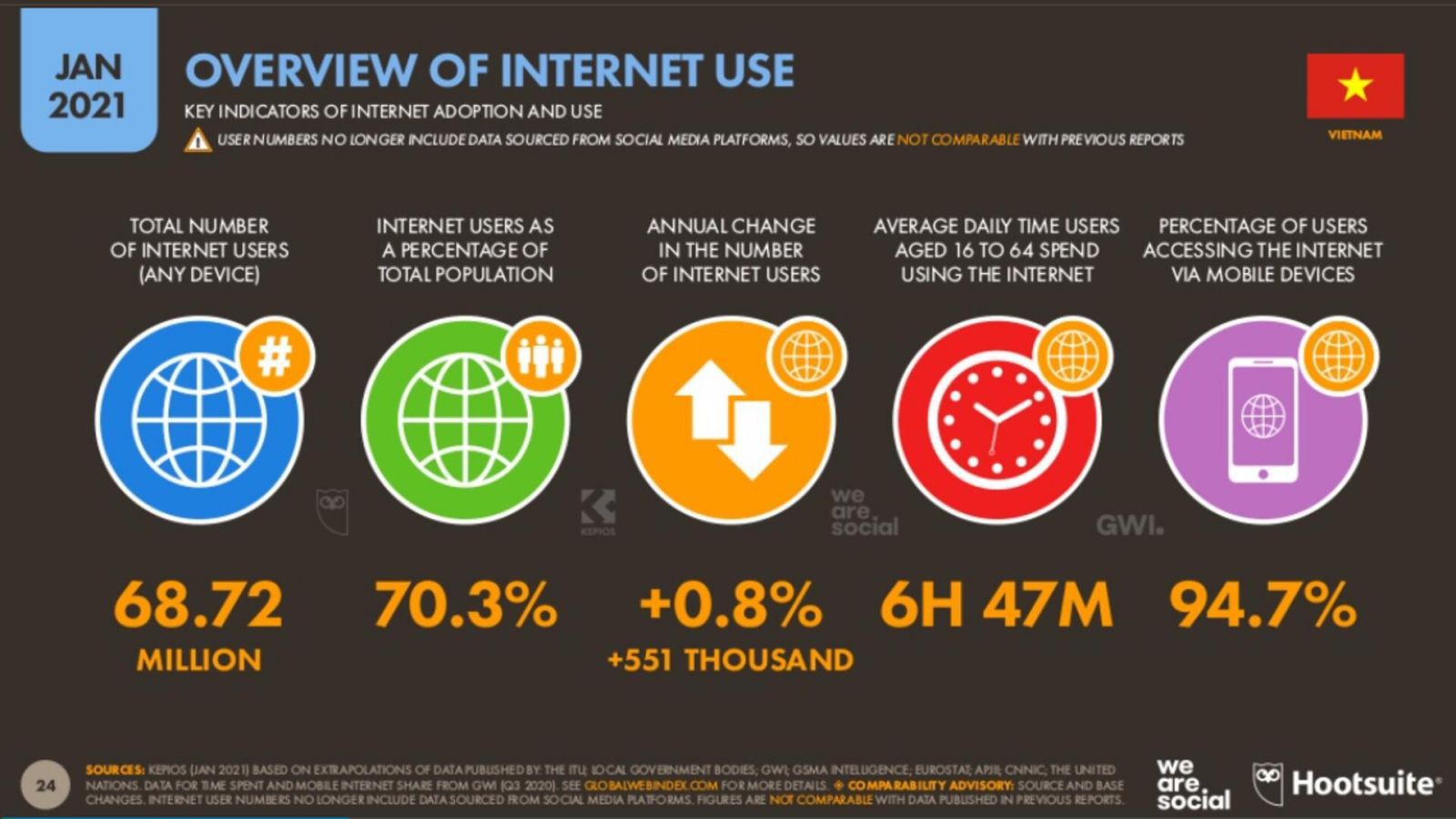 Tính đến tháng 1/2021, dân số Việt Nam đạt mốc 97.8 triệu dân. Trong đó, có khoảng 68.17 triệu người đang sử dụng Internet (chiếm 70.3% dân số) thông qua các nền tảng, ứng dụng khác nhau, với thời lượng trung bình là 6 giờ 47 phút. Đây được xem là khoảng thời gian tương đối lớn được sử dụng trong 1 ngày.