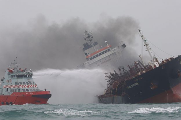 Tàu cứu hộ tiếp cận tàu Aulac Fortune bốc cháy trên biển HongKong đầu năm 2019. Ảnh: South China Morning Post