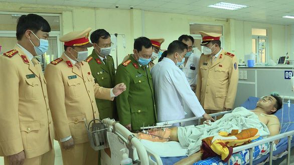 Lãnh đạo Cục Cảnh sát giao thông đến thăm hỏi, động viên Thượng úy Lê Q. Toàn. Ảnh: Tuổi trẻ)