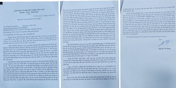 Cụ thể, trong đơn gửi Toà soạn Việt Nam Hội nhập, ông Nguyễn Văn Hưng viết: “Tháng 10 năm 2018, tôi được nhận mảnh đất từ bố tôi để lại là thửa đất số 11 thuộc thửa đất số 1024 KDC Cầu Đất, Cầu Đo, Khai Quang, Vĩnh Yên (tổng diện tích là 140 mét vuông), có quyết định giao đất từ năm 2003, nhưng do bận công tác tại Hà Nội nên gia đình tôi chưa xây tường bao để xác định vị trí sở hữu”. Theo ông Hưng, mảnh đất đó của nhà ông đã bị gia đình ông Khánh xây vào... Mặc dù ông đã có đơn từ, nhưng cho đến nay sự việc vẫn chưa được TP Vĩnh Yên xử lý.