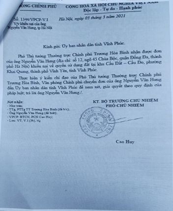 Hơn thế, ngày 03/3/2021, thực hiện ý kiến chỉ đạo của Phó Thủ tướng Chính phủ thường trực Trương Hòa Bình, Văn phòng Chính phủ đã có công văn số 1344/VPCP-V.I yêu cầu UBND tỉnh Vĩnh Phúc xem xét giải quyết vụ việc theo quy định của pháp luật. Tiếp đến, ngày 17/03/2021, UBND tỉnh Vĩnh Phúc đã có công văn số 1766/UBND-TD3 gửi UBND thành phố Vĩnh Yên yêu cầu thành phố làm việc trực tiếp với ông Hưng và giải quyết theo quy định, báo cáo kết quả về Văn phòng Chính phủ, UBND tỉnh trước ngày 10/4/2021.