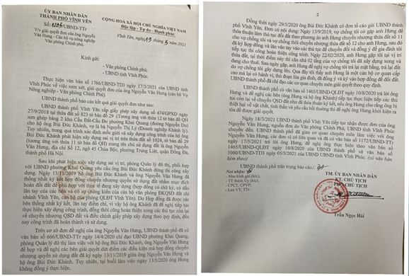 Đặc biệt, liên quan đến vụ việc này, T3/2021, UBND tỉnh Vĩnh Phúc đã yêu cầu UBND thành phố Vĩnh Yên trước ngày 10/4/2021 phải gửi báo cáo về Văn phòng Chính phủ và UBND tỉnh, nhưng đến tận ngày 19/5/2021, UBND TP Vĩnh Yên mới có văn bản báo cáo.