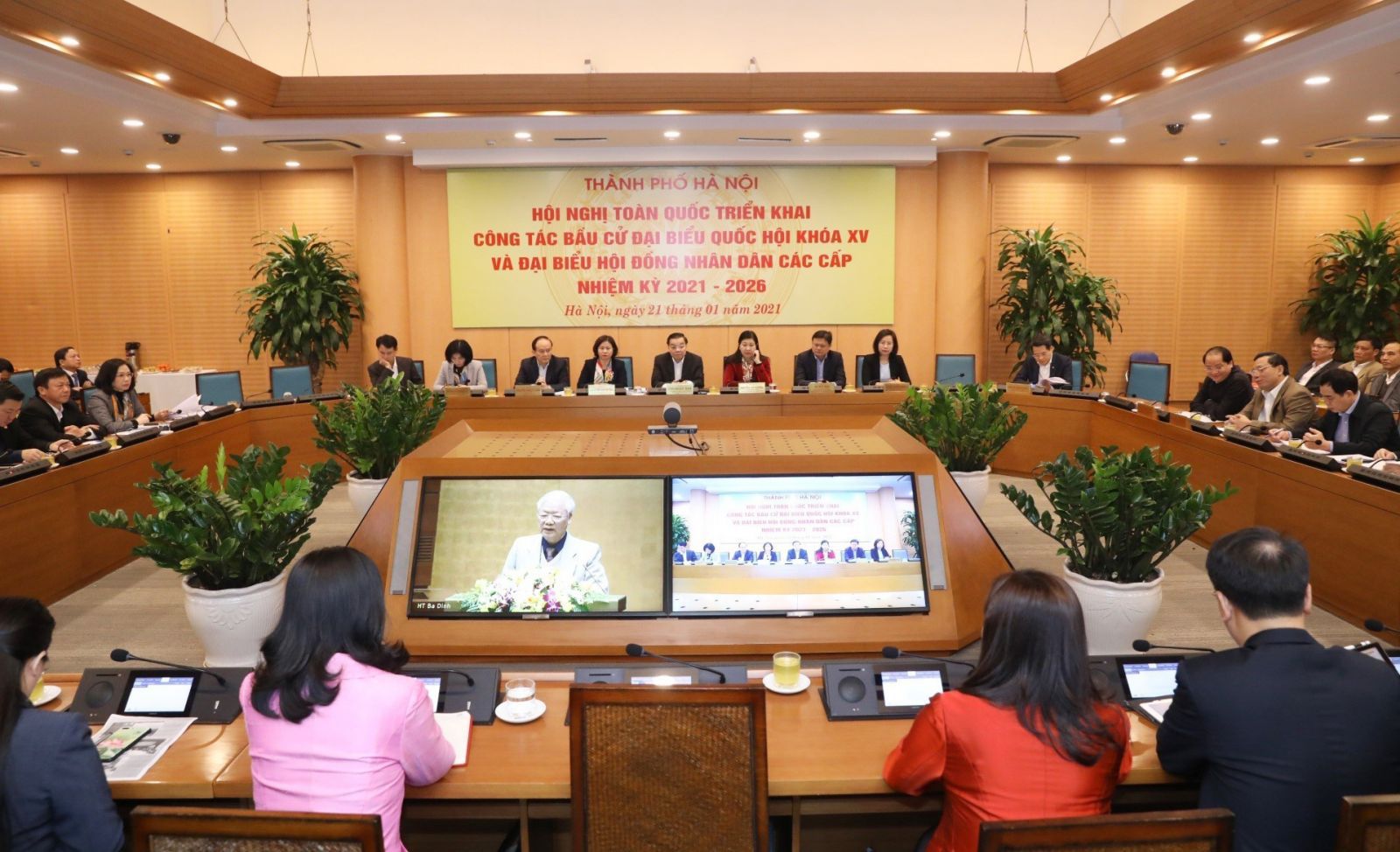 Hội nghị toàn quốc triển khai công tác bầu cử đại biểu Quốc hội khóa XV và hội đồng nhân dân các cấp nhiệm kỳ 2021 - 2026 tại điểm cầu trụ sở Ủy ban nhân dân thành phố Hà Nội_Ảnh: TTXVN