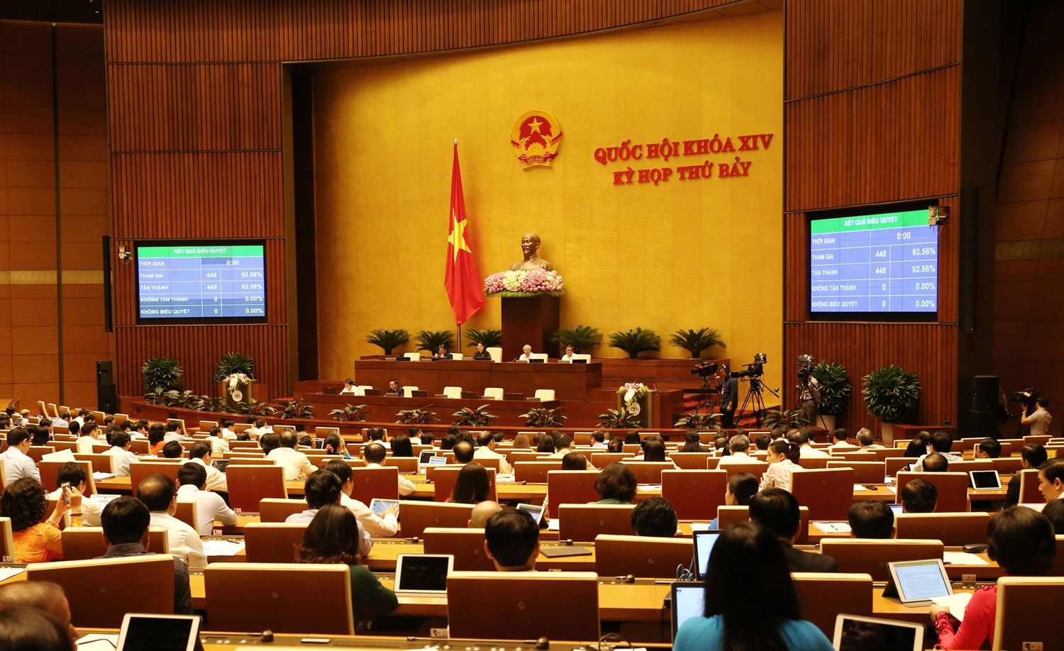Quốc hội biểu quyết thông qua toàn văn Luật Kinh doanh bảo hiểm và Luật Sở hữu trí tuệ tại Kỳ họp thứ bảy, Quốc hội khóa XIV _Ảnh: TTXVN