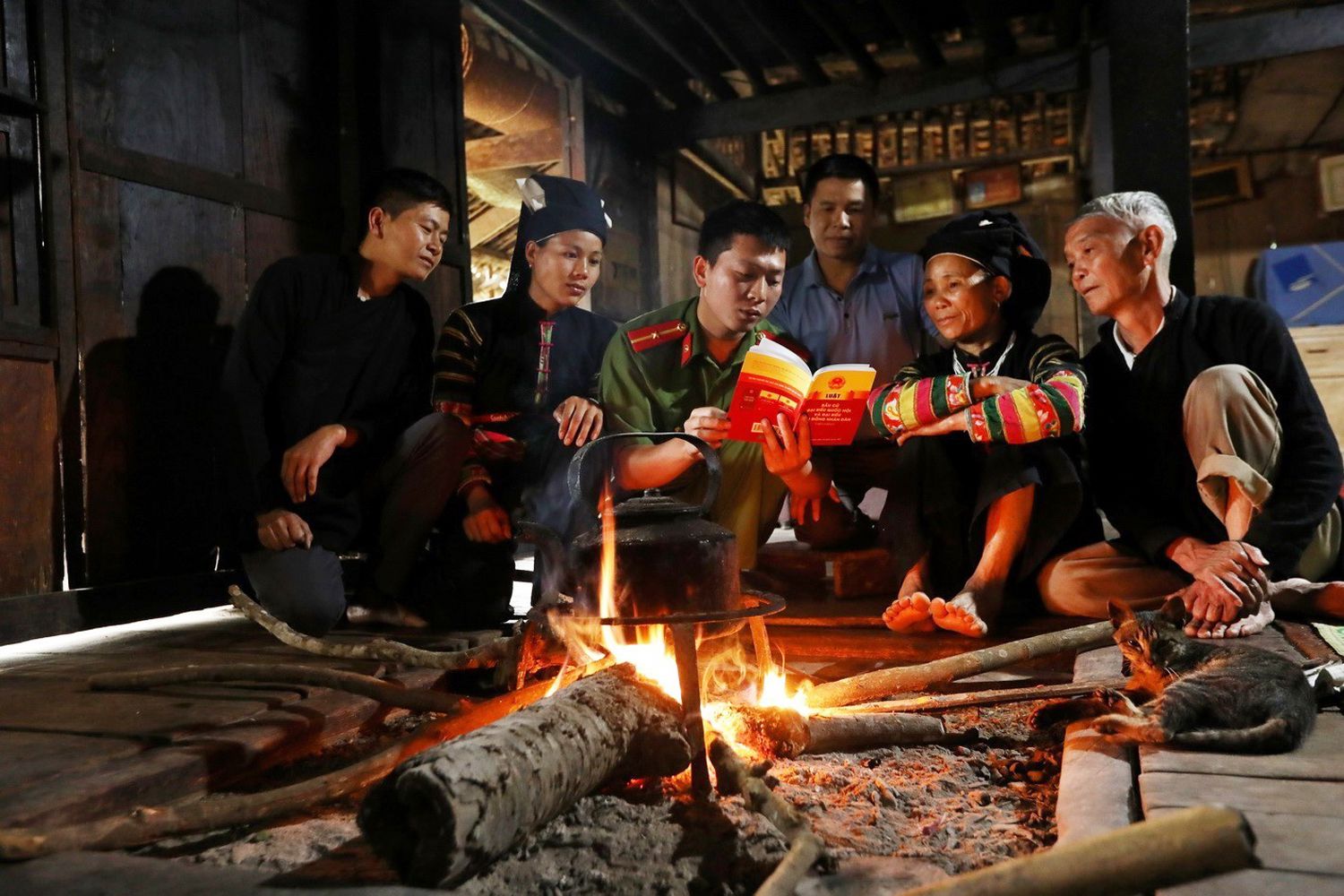 Cán bộ, chiến sĩ Công an nhân dân phổ biến về Luật Bầu cử đại biểu Quốc hội và đại biểu hội đồng nhân dân các cấp tới đồng bào dân tộc Lô Lô ở xóm Khuổi Khon, xã Kim Cúc, huyện Bảo Lạc, tỉnh Cao Bằng _Ảnh: TTXVN