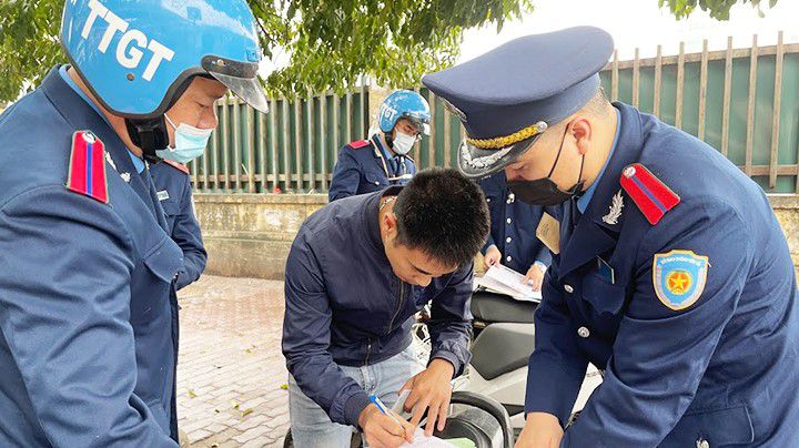 Thanh tra giao thông Hà Nội lập biên bản xử phạt lái xe vi phạm chạy không đúng tuyến.