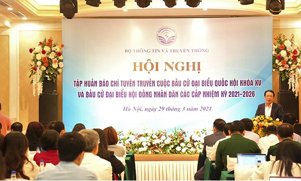 Đồng chí Hoàng Vĩnh Bảo - Thứ trưởng Bộ Thông tin và Truyền thông, Phó Chánh Văn phòng Hội đồng bầu cử quốc gia phát biểu khai mạc hội nghị Tập huấn Báo chí truyên truyền về bầu cử.