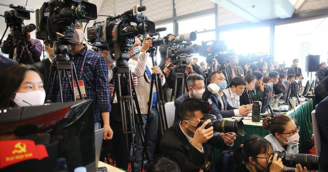 Các phóng viên trong nước và quốc tế đưa tin phiên bế mạc Đại hội đại biểu toàn quốc lần thứ XIII của Đảng_Ảnh: TTXVN